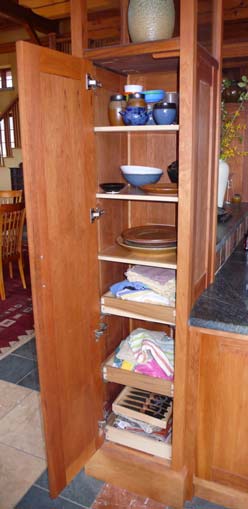 Towers with glass display shelf, inside storage, and book matched figured cherry wood.