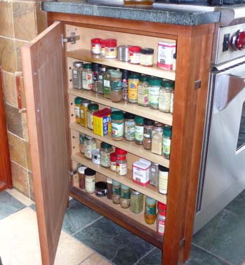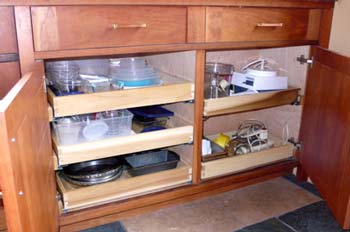 Detail showing roll-out shelving and the easy access it provides to all your under counter kitchen storage. Note full extension concealed drawer slide mechanism