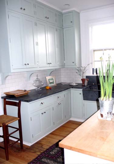 Painted kitchen with soapstone counters and . butcher block island, design by karen Turner
