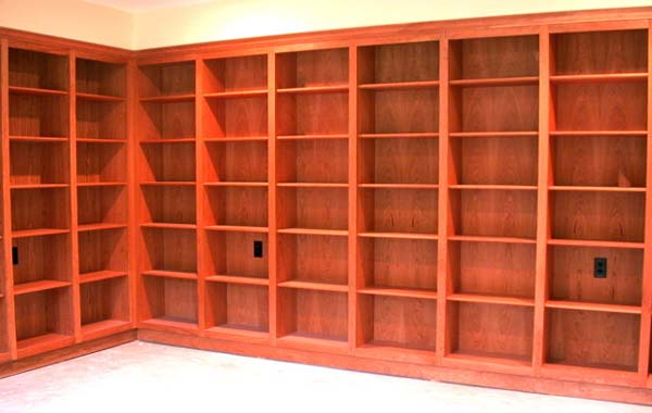 .Cherry adjustable wall to wall bookshelving, with natural finish.