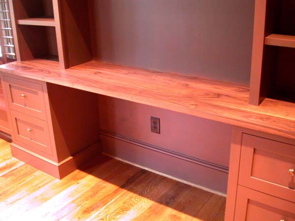 Built-in desk with walnut counter, file drawers and shelving.