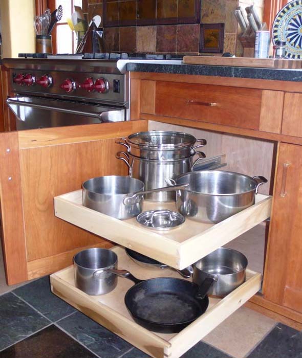 Detail showing roll-out shelving and the easy access it provides to all your under counter kitchen storage. Note full extension concealed drawer slide mechanism