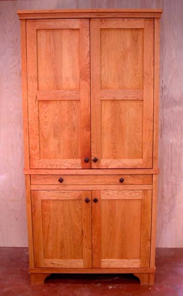 Cherry entertainment cabinet, with flat panel doors, wlanut knobs, slide away pocket doors and roll-out drawers.