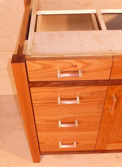 Chery and walnut bathroom vanity, shown without countertop.