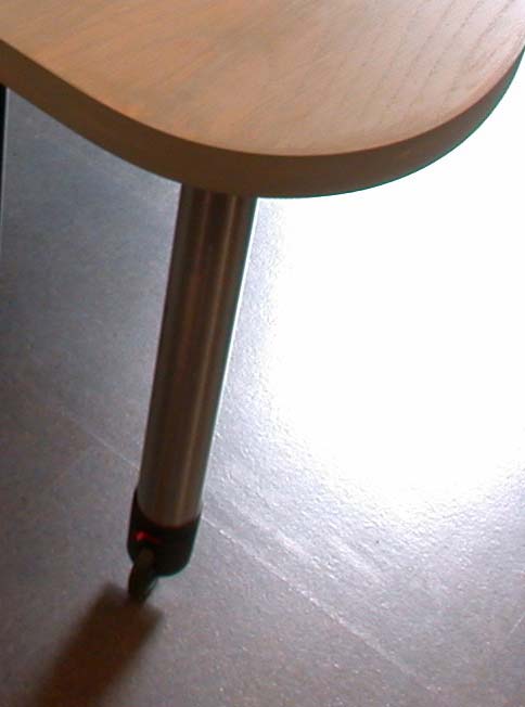 Curve Table showing metal leg detail, with swivel, and oak top.