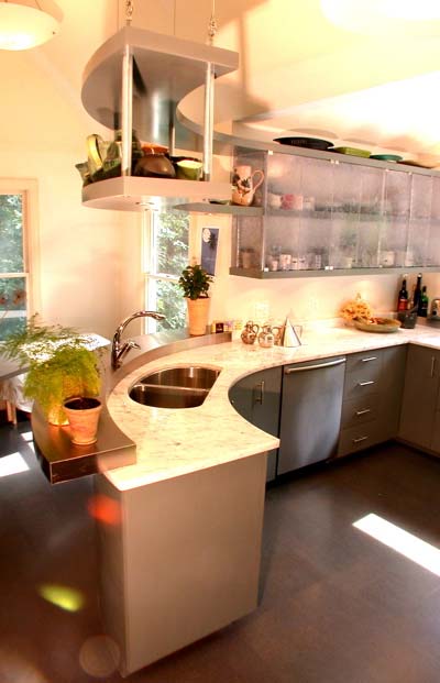 Kitchen island with curved counter and suspended shelving design by Allison Ewing